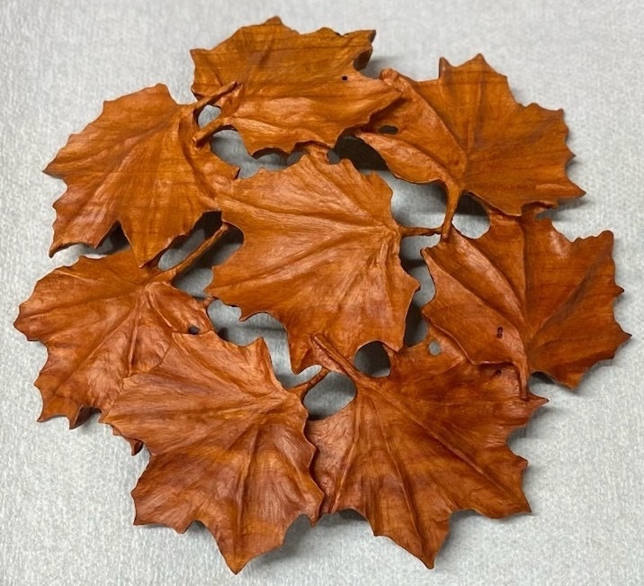| For our October 9 meeting, Milton Miller shared his insights on sanding. Among the topics he discussed: use denatured alcohol to highlight any scratches, do not sand your piece too smooth or you may run into finishing issues - 220 grit is usually the smallest grit sandpaper you need to use, turn on your sander when it is resting on the wood surface | | | | John Champion led us through his journey to create an extremely detailed Pie Crust table. Each step from the decision to create, design as well as sample pieces provided the details of John's dedication to complete his beautiful finished piece of historic furniture. If you missed this presentation or wish to view it again go to our website for the video. | | | | Power Carving Workshop Taught by Sammy Long – A Scholarship Write-up by Kim Muthersbough |  | When the leaves start to turn color and the weather begins to cool off during mid-October, what better time of year to carve some leaves? Thank you to the Woodworkers Guild of Georgia for help that made it possible for me to participate in a power carving class taught by Sammy Long. The class was a four-day workshop that was arranged by the Atlanta Woodturners Guild and was held at Woodcraft.