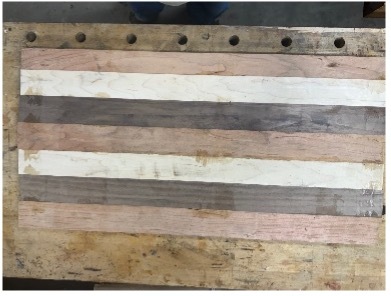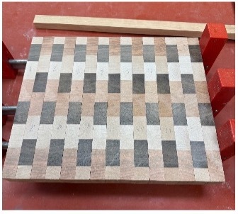 The class started with some fundamentals of end-grain vs face grain as well as shop safety. The steps to making the cutting board were discussed along with need to use precisely milled lumber. Pieces of maple cherry and walnut were pre-milled to approximately 1”x2”x24”. Each student selected 7 pieces of wood. I selected 2 walnut, 2 maple and 3 cherry bords. The next step was to glue the boards together to make a single striped plank that was about 12” wide by 24” long (Figure 1). This was left to cure for approximately 30 minutes. The evening continued with scraping off any glue squeeze out and running the plank through the drum sander to ensure that the surfaces were smooth and parallel. The next step was to cut strips off of the plank that were about 1 ½”, the desired thickness of the cutting board. Once these pieces were cut, they were laid out with the end grain facing up (Figure 2). This was followed by rotating every second piece by 180 degrees to create the final pattern of the cutting board. From there it was back into the clamps for the second and final glue up. This concluded the first evening.